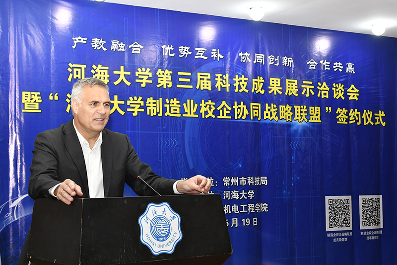 张兵在致辞中,对作为第十三届中国常州先进制造技术成果展示洽谈会系列活动之——Bwin必赢网站入口第三届科技成果展示洽谈会暨Bwin必赢网站入口制造业校企协同战略联盟签约仪式的举办表示热烈祝贺,对常州市各级政府及各位企业家对我校的信任与支持表示衷心感谢。他指出,制造业校企协同战略联盟的成立,旨在“推进产教融合、深化协同培养、促进协同创新、实现互利共赢”,这是校企合作新模式的又一次积极探索。希望以此次战略联盟的成立为契机,深入探索人才培养、科研合作、成果转化等校企合作新模式,充分发挥企业创新主体的项目资源优势和我校创新要素的集聚优势,为高校和地方产教融合谏言献策、为校企深度合作提供思路对策,努力将联盟打造成为全省乃至全国校企协同的成功典范。