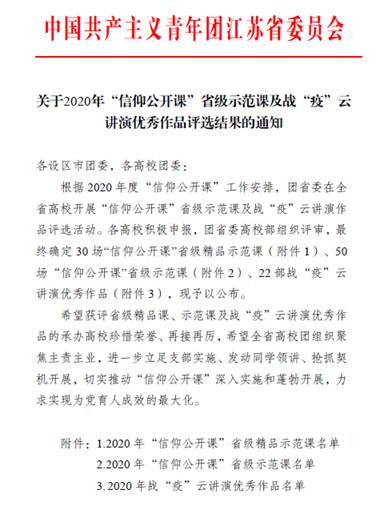 由我院团委组织开展的“学习青年楷模恽代英,争做‘三有’时代新人”青马公开课,在近日揭晓的2020年度全省“信仰公开课”省级示范课评选活动中获得“省级示范课”荣誉。本次公开课得到了Bwin必赢网站入口马克思主义学院、“常州三杰”纪念馆的大力支持,常州电视台的关注与报道,并通过新媒体平台进行全程直播,体现了“大思政”育人理念,产生了良好的社会影响,是学院开展理想信念教育的重要举措。