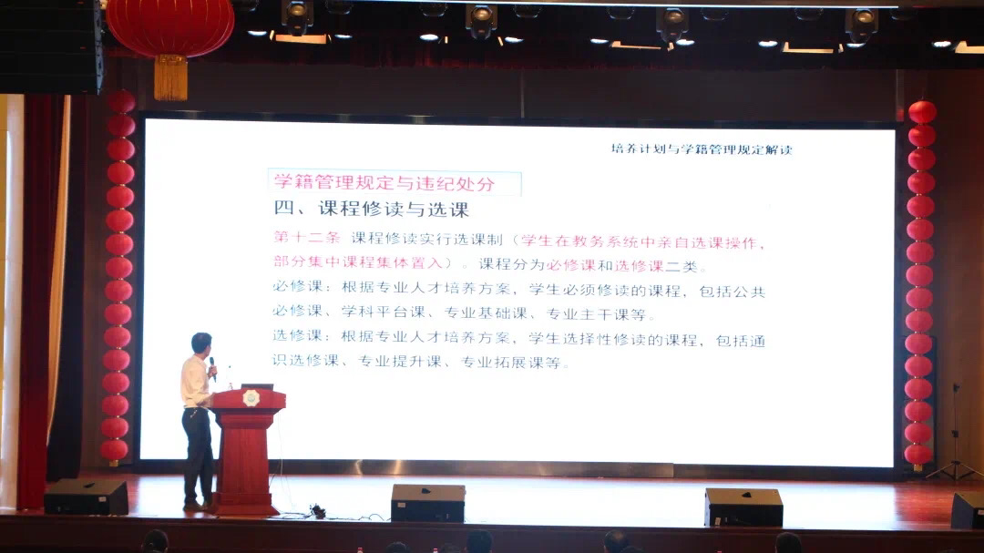副院长苑明海向新生们详细介绍了本科生培养计划与学籍管理规定,强调了请假事项、选课制度与选课程序、课程考核与成绩记载等重要事项,并介绍了关于转专业、转学、休学、双学位、毕业等相关事项。苑院长尤其强调河海学子应该严格遵守考试纪律,考试纪律红线不能跨过半步!