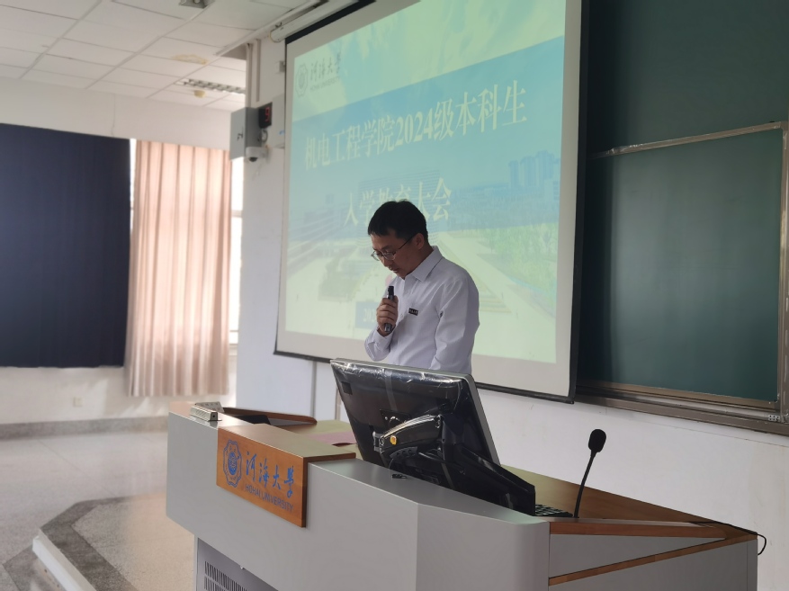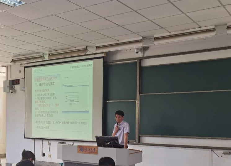 苑明海副院长为新生解读了学籍管理规定和培养方案,详细介绍了选课、考勤、课程考核等内容,并以机械工程专业2024版培养方案为例介绍了培养方案的构成以及使用方法。